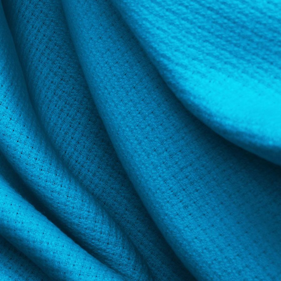 La tela base es un tweed-chanel, compuesta por 100% poliéster, con un gramaje de 420 gr/m2 y un ancho de 150cm. El color liso impreso es un tono azul mariposa, con una tinta cyan de 78 y una tinta magenta de 28, según los datos del CMYK: 78 28 0 0. Este tono azul simboliza la calma y la confianza, y técnicamente, se combina perfectamente con otros tonos azules y grises, creando un conjunto visualmente atractivo.