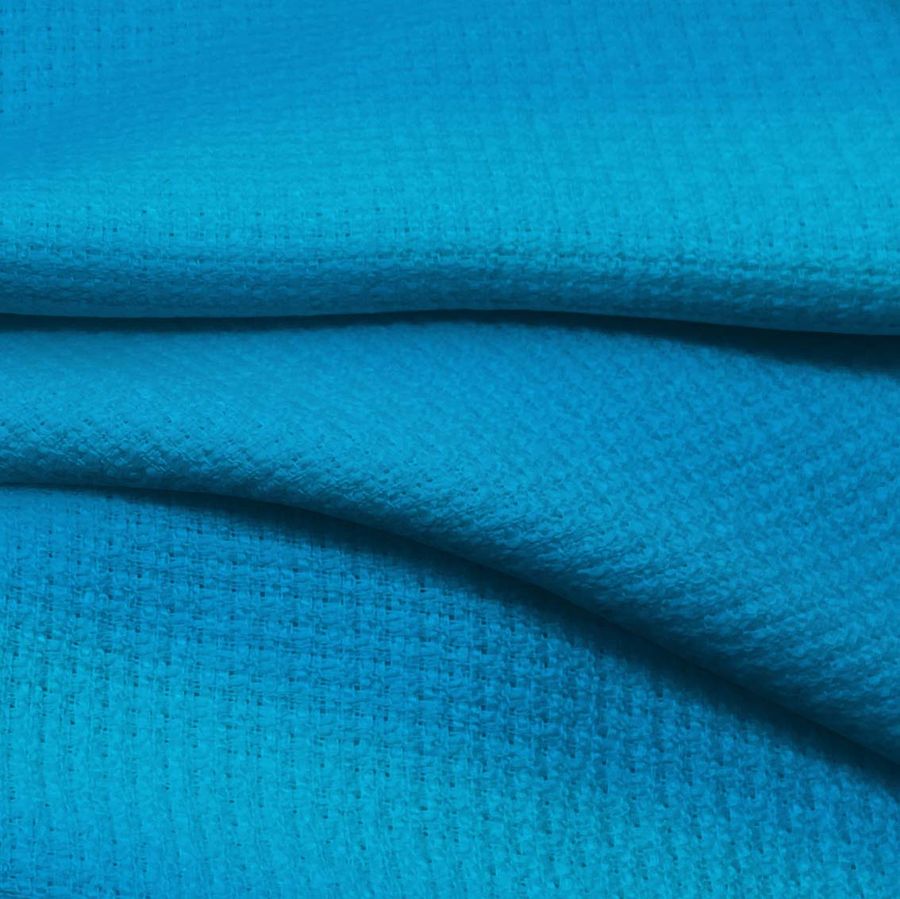 Por último, la tecnología de impresión utilizada en este tejido es la sublimación de poliéster, donde la tinta se convierte en gas y se fusiona con las fibras de la tela, proporcionando una impresión duradera y resistente. En conclusión, el tweed-chanel con el tono azul mariposa se convierte en un tejido de alta calidad y versatilidad, adecuado para múltiples aplicaciones y usos en la industria textil.