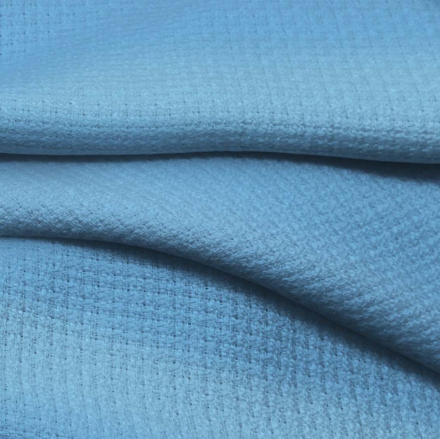 La tela base de este tejido es el Tweed - Chanel, un tejido de poliéster de 420 gr/m2 de gramaje y 150 cm de ancho. El color liso impreso es un Azul seda, que se obtiene a través de una tinta Cyan del 60%, Magenta del 20%, Yellow del 1% y Black del 0%, con una composición de 60 20 1 0 en CMYK. Este color se caracteriza por ser elegante, tranquilo y relajante. Combina perfectamente con colores neutros como el blanco y el gris, y también con tonos tierra como el marrón y el beige.