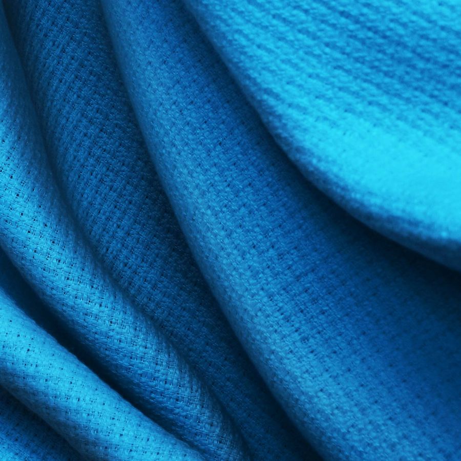 La tela base para este tejido es el Tweed - Chanel, compuesta al 100% de poliéster, con un gramaje de 420 gr/m2 y un ancho de 150 cm. El color liso impreso es un tono azul con matiz de ojos azules, cuyos atributos de CMYK son 92, 57, 13 y 2 para las tintas cian, magenta, amarillo y negro, respectivamente. Este color azul se describe como muy calmado, sereno y elegante, evocando la calma del cielo sin nubes ni viento, con un toque de emoción y sensualidad en los ojos azules que inspira calma y seguridad. Combina bien con otros tonos fríos como el gris, el blanco, el plateado y el negro, siendo ideal para ropa formal y de negocios. Este tejido está impreso únicamente en una cara por impresión digital textil, no siendo un tejido teñido sino impreso.
