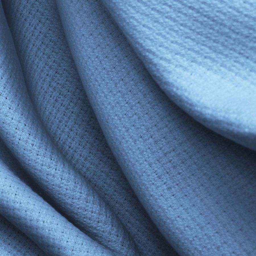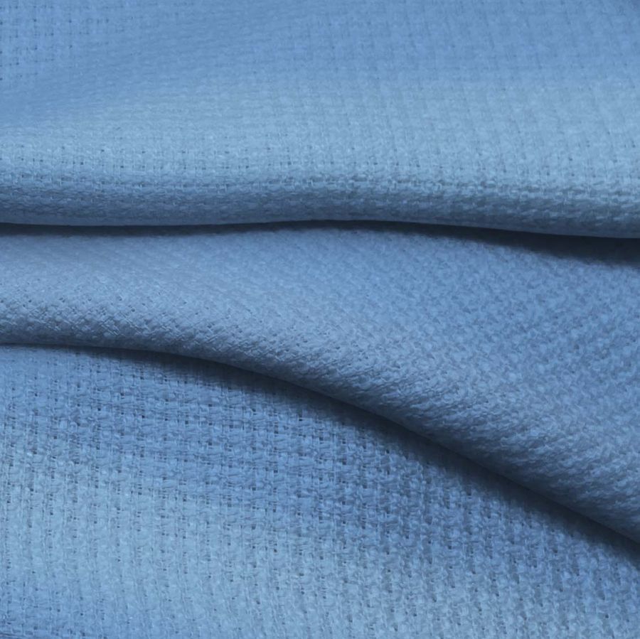 La tela base es el Tweed-Chanel, compuesta de 100% POLIÉSTER, con un gramaje de 420 gr/m2 y un ancho de tela de 150 cm. El color liso impreso es el Azul Iceberg, con una combinación de CMYK de 62 33 3 0. Simbólicamente, este color representa la pureza, frescura y serenidad de los glaciares. Técnicamente, es un tono de azul claro con una pequeña cantidad de cyan, casi nula cantidad de yellow y ausencia de black. Combina perfectamente con tonos neutros como el gris y el beige, así como con tonos azules oscuros y medios.