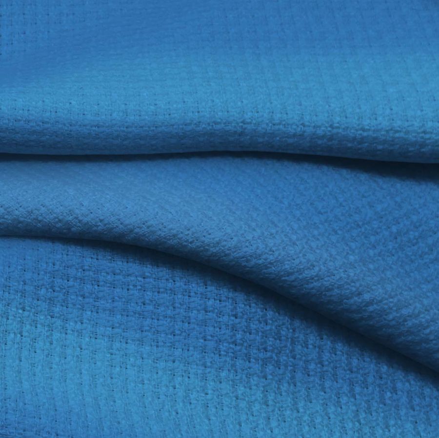 La tela base Tweed - Chanel es un tejido de poliéster de 420 gr/m2 de peso y un ancho de 150 cm. Su color liso impreso es un tono azul Windows con un CMYK de 81 48 4 0, cuyas características simbolizan la tranquilidad y la armonía. Este color secundario combina especialmente bien con tonos tierra, grises y blancos.
