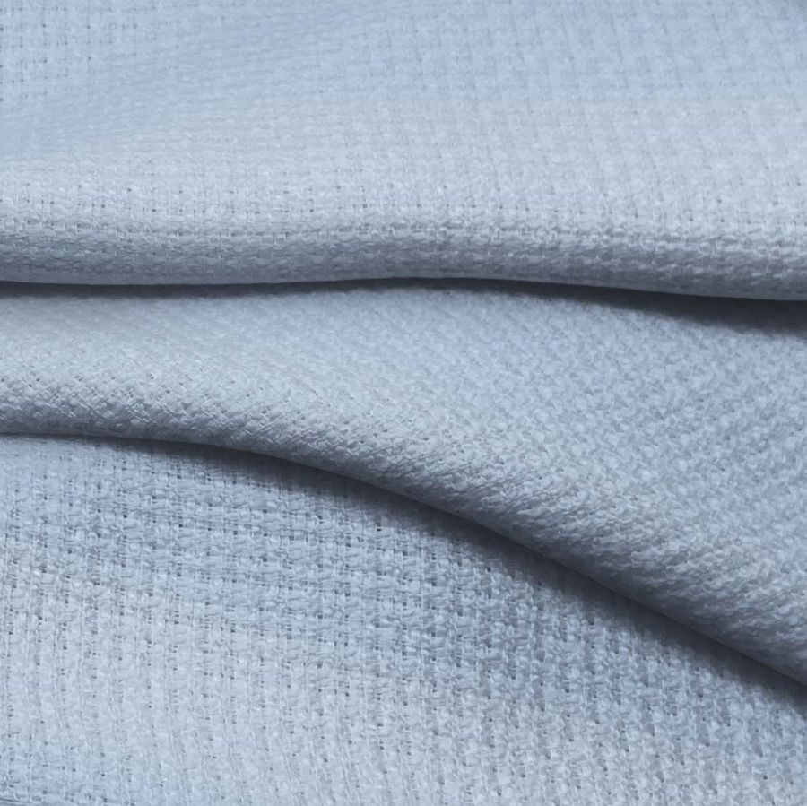 La tela base es un Tweed - Chanel. Su composición es 100% poliéster con un gramaje de 420 gr/m2 y un ancho de 150 cm. El color liso impreso es un Angel Azul con CMYK de 34 16 3 0. Este color se describe como un azul pastel con tonalidades grises y un matiz de violeta suave que sugiere serenidad y calma. Este color combina muy bien con tonos beige y marrones, así como con tonalidades grises. Es importante destacar que el tejido está impreso con el color liso a una sola cara por impresión digital textil.