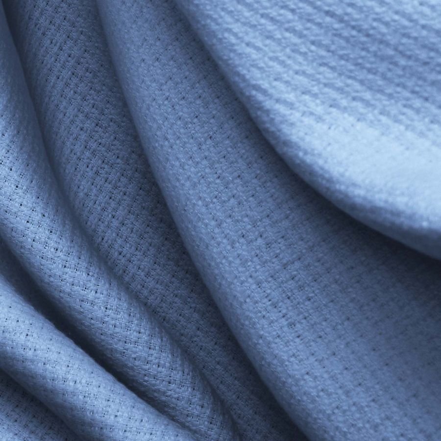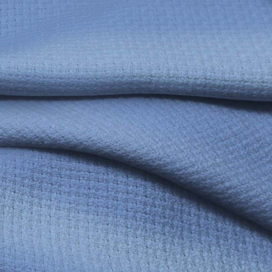 La tela base, Tweed - Chanel, es un tejido de tipo tweed con una composición del 100% de poliéster, con un gramaje de 420 gr/m2 y un ancho de 150cm. El color liso impreso, Azul/Azul violeta claro, se describe con CMYK: 60 38 4 0 y se caracteriza por un tono equilibrado entre el azul y el violeta claro, generando una sensación de tranquilidad y serenidad. Además, combina perfectamente con un amplio rango de colores como el gris, negro, blanco, verde y rosa. Es importante destacar que la tela está impresa con el color liso a una sola cara por impresión digital textil, lo que significa que el tejido no está tintado sino impreso por una sola cara.