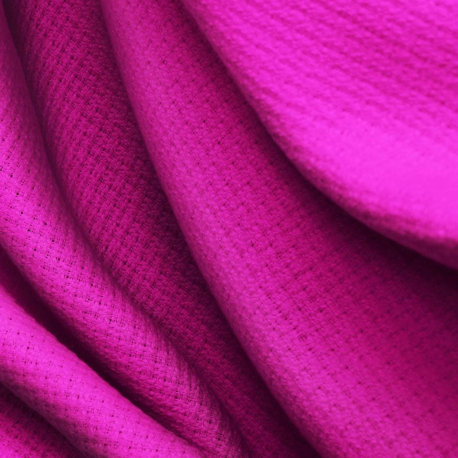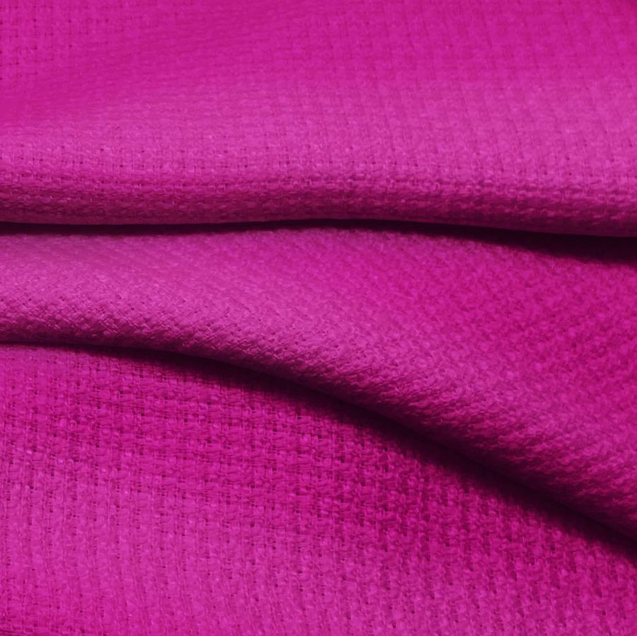 La tela base Tweed - Chanel, con un gramaje de 420 gr/m2 y una composición del 100% poliéster, tiene un ancho de 150 cm. El color liso impreso es de un tono rosa con matices de DarkMagenta, con una tinta Cyan del 29, Magenta del 100, Yellow del 4 y Black del 1, representando un CMYK de 29 100 4 1. El color secundario, el magenta, es un color vibrante y enérgico que simboliza la creatividad y la emoción. Este color combina perfectamente con tonos neutros como el gris o el negro, y también con tonos complementarios, como el verde o el amarillo.