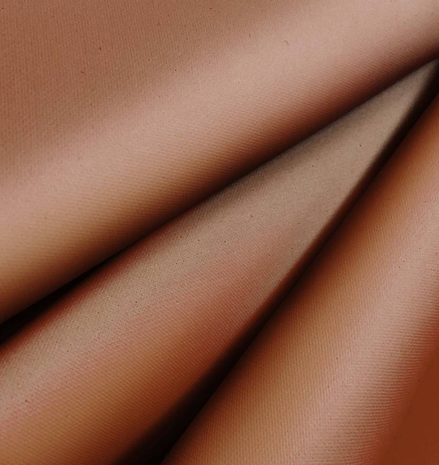 La tela base es la Tela Impermeable - Outdoor, un tejido técnico de 100% poliéster con un gramaje de 200 gr/m2, ancho de 150 cm y acabado impermeable, que le confiere alta resistencia y durabilidad. El color liso impreso es Marrón, con un CMYK de 33 58 68 35, que se traduce en un tono Oso Café con textura granulada y rugosa al tacto. Este color, que combina muy bien con gamas de grises, beiges y verdes, entre otros, está impreso a una sola cara por impresión digital textil, lo que permite una alta calidad de imagen y una amplia variedad de diseños.