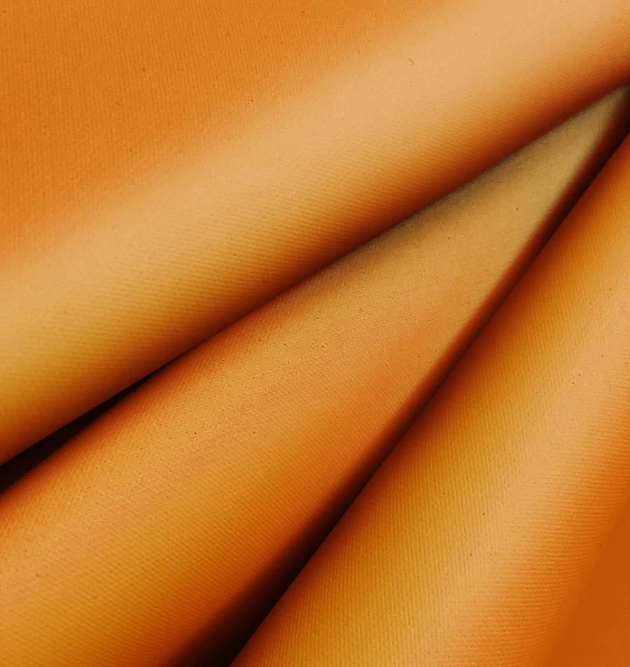 La tela base es la Tela Impermeable - Outdoor, un tejido técnico compuesto por 100% poliéster con un gramaje de 200 gr/m2 y un ancho de 150 cm. Su color liso impreso es de un naranja basket ball, definido por los atributos de color CMYK 18 60 100 7. Este color se compone de una base de amarillo intenso con un matiz naranja que lo hace similar al color de una pelota de baloncesto. En combinación, este color secundario encaja a la perfección con tonos neutros como grises o beige claro que potencian su intensidad y lo hacen destacar.