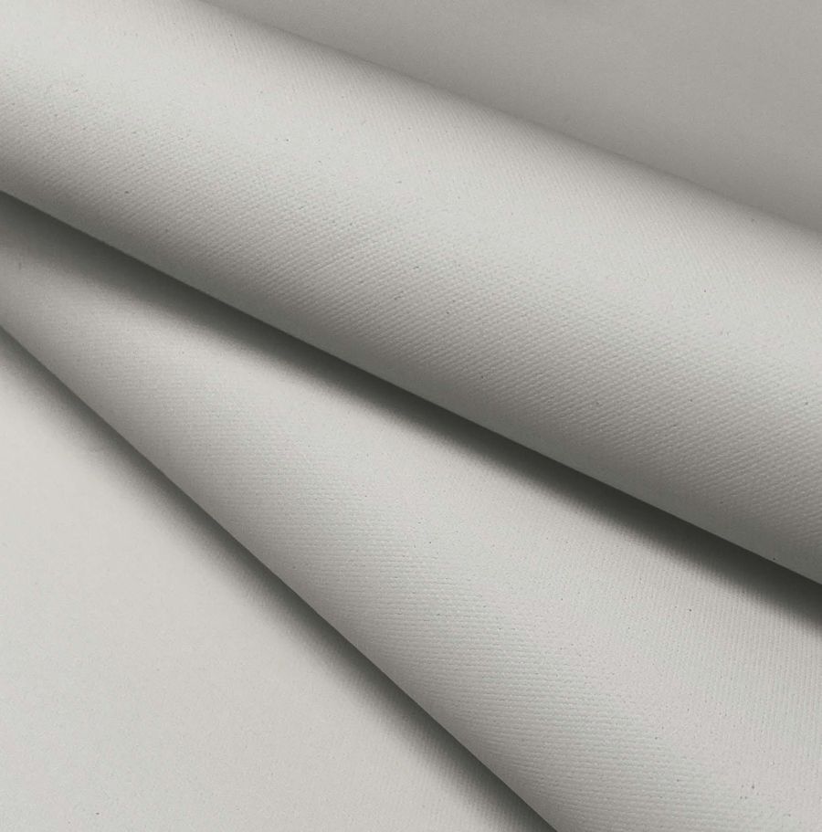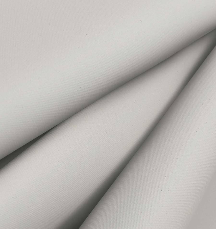 Cabe mencionar que la tela está impresa con el color liso a una sola cara por impresión digital textil, lo que significa que la pigmentación de color se asienta solo en la superficie de la tela base. Las características de la tela base incluyen su acabado impermeable, su textura granulada y rugosa al tacto, así como su opacidad visual. La combinación de estas propiedades con el color crudo y cremoso impreso crea una sensación de rusticidad y naturalidad.