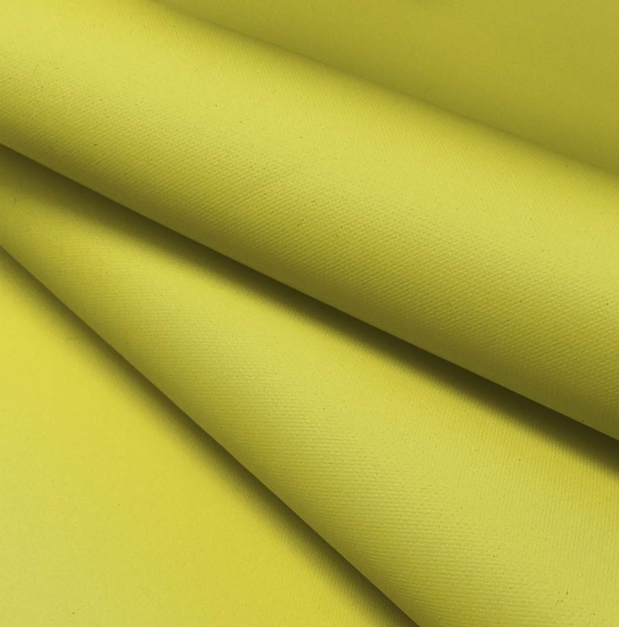 El color liso impreso en la tela es amarillo canario, el cual está compuesto por una combinación de tintas cian y amarilla con un mínimo de magenta y negro, como se indica en el CMYK de 9 0 81 0. Este color es muy vibrante y alegre, lo que lo hace perfecto para prendas y accesorios de moda tanto para hombres como para mujeres.