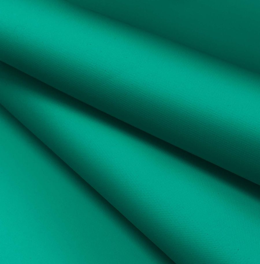 La tela base utilizada es la Tela Impermeable - Outdoor, una tela técnica de 100% poliéster, con un gramaje de 200 gr/m2 y un ancho de tela de 150cm. Su acabado es impermeable, lo que la hace ideal para su uso en exteriores. Además, su textura es granulada y rugosa al tacto, lo que le da una resistencia adicional. El color liso impreso en esta tela es un tono de verde menta oscura, con CMYK 84 23 64 7, lo que se traduce en una mezcla de cian, magenta, amarillo y negro en su impresión.