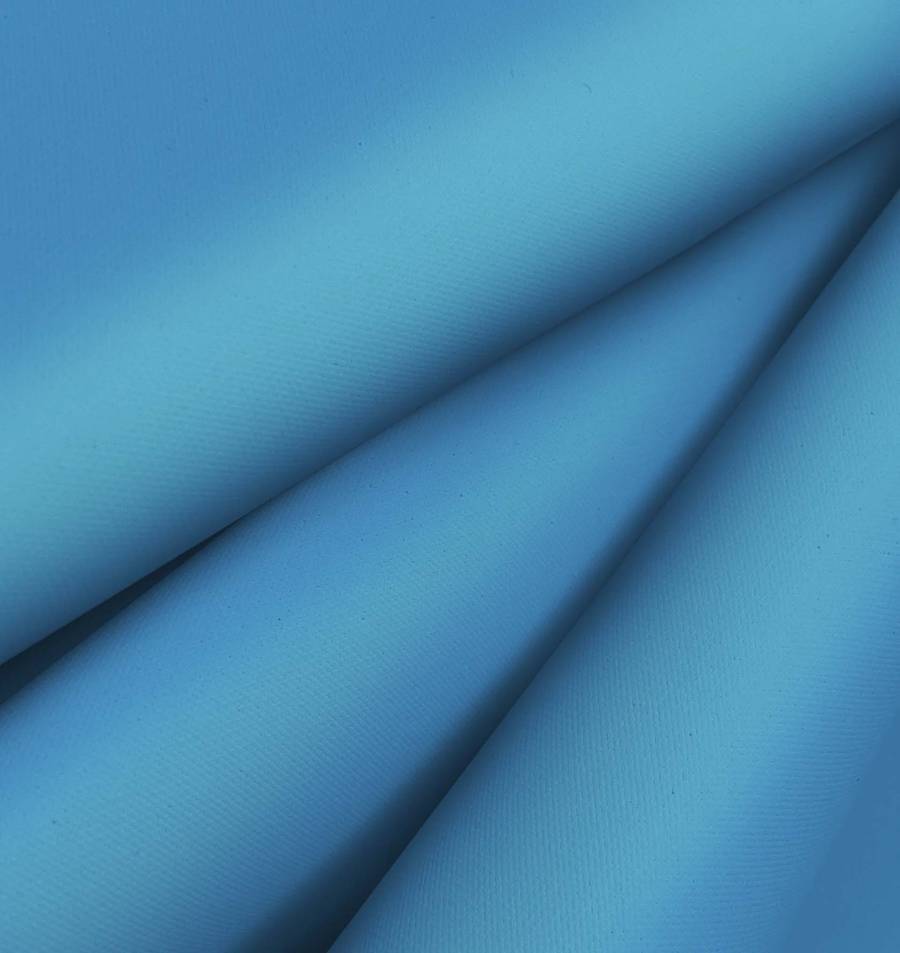 La tela base, Tela Impermeable - Outdoor, es un tejido técnico compuesto por 100% poliéster, con un gramaje de 200 gr/m2 y un ancho de 150 cm. Es impermeable, con una textura granulada y rugosa, así como opaca visualmente. El color liso impreso es un tono azul seda, con un CMYK de 72 34 2 0, que combina perfectamente con tonos de azul claro y verde. El tejido está impreso con el color liso a una sola cara por impresión digital textil.