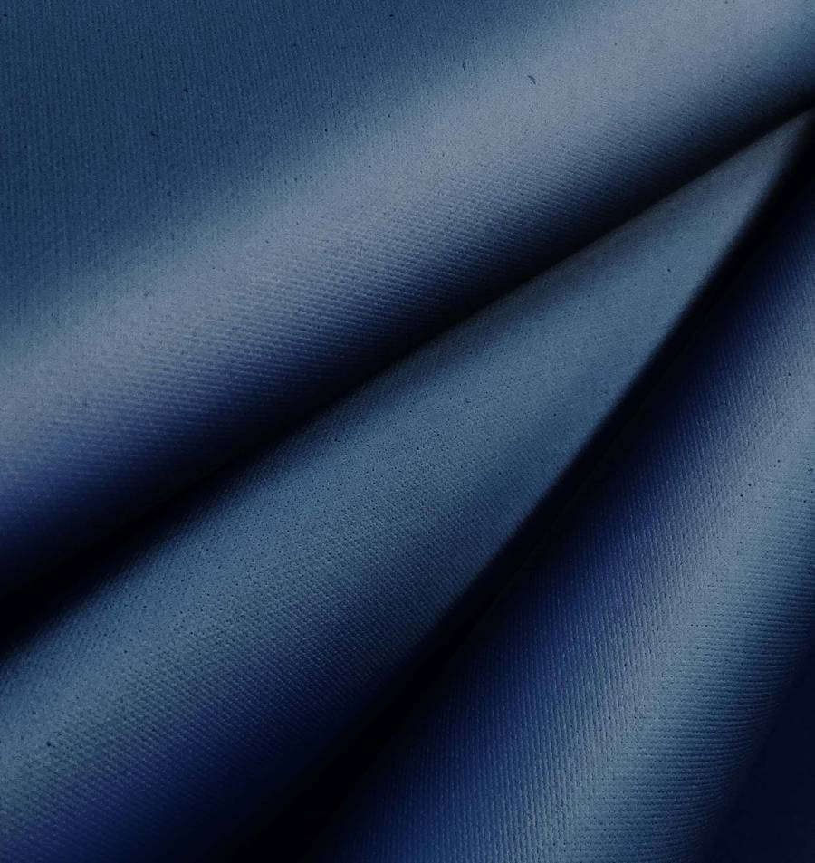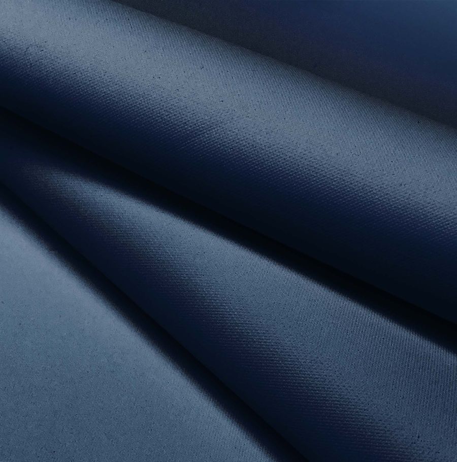 La tela base, Tela Impermeable - Outdoor, es un tejido técnico compuesto al 100% de poliéster con un gramaje de 200 gr/m2 y un ancho de 150 cm. Su color liso impreso es un hermoso tono de azul marino profundo que se consigue mediante la tecnología de sublimación con una tinta Cyan al 100, Magenta al 80, Yellow al 41 y Black al 35, cuyo resultado en el modelo de colores CMYK es 100 80 41 35. Este color es un tono muy versátil que combina perfectamente con tonos neutros, como el blanco o el gris, y añade dramatismo y profundidad en combinación con tonos tierra, como el marrón o el verde. Cabe destacar que la tela está impresa con el color liso a una cara mediante impresión digital textil, lo que significa que no es un tejido tintado, sino impreso por una sola cara.
