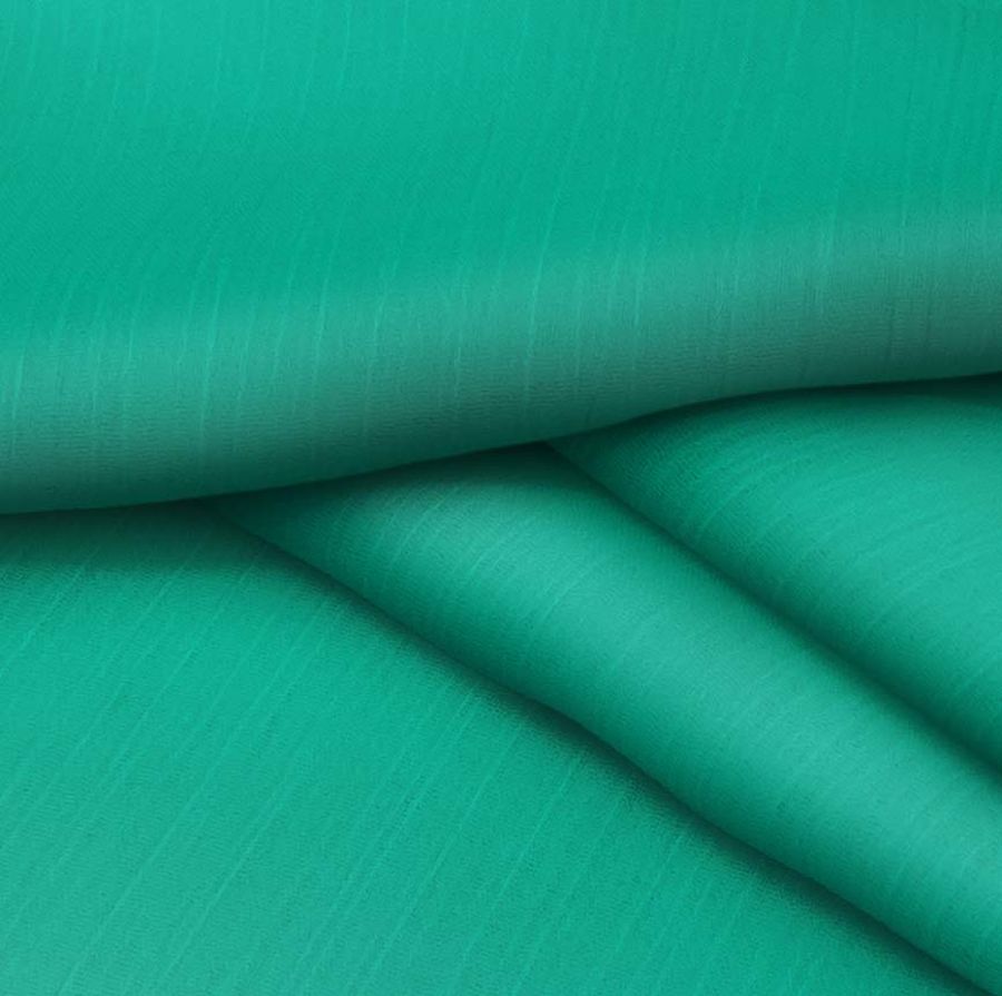 La tela base de esta descripción es la Gasa Crepe Plisada - Bangkok, con una composición 100% POLIÉSTER, gramaje de 90 gr/m2 y ancho de 150 cm. El color liso impreso es verde acuático, con una combinación de tinta Cyan: 82, Magenta: 16, Yellow: 62 y Black: 2. Este color se presenta como un tono suave con tintes azulados, que evoca a la naturaleza, el mar y la calma. Combina bien con colores como el blanco, rosa pálido, dorado y plateado.