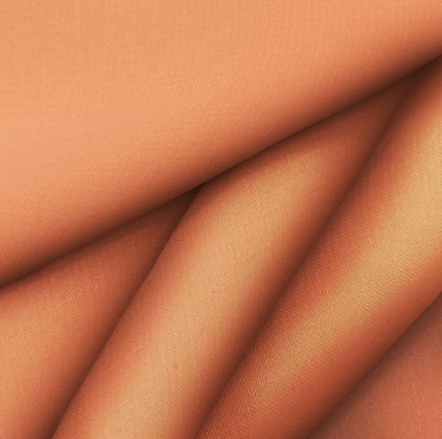 La tela base, Gasa Transparente - Salamanca, fabricada en 100% poliéster, tiene un gramaje de 28 gr/m2 y un ancho de 150 cm. El color liso impreso es una mezcla de rojo y arena del desierto, como se indica en su CMYK 0 69 73 0. Este color secundario se caracteriza por su tonalidad cálida y terrosa, destacando su capacidad para transmitir el ambiente del desierto. Combina bien con tonos marrón oscuro, dorado, verde y tonos cálidos que resaltan sus vibraciones naturales. La tela se imprime a una sola cara por impresión digital textil, no siendo un tejido tintado sino impreso por una sola cara, obteniendo tacto suave y agradable.