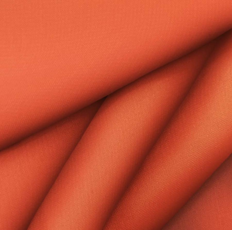 La tela base es Gasa Transparente - Salamanca de 100% poliéster con un gramaje de 28gr/m2 y una anchura de 150cm y está impresa con un color liso en rojo annato mediante tecnología de sublimación. El color secundario es un tono naranja-rojizo cálido que simboliza la pasión y la vitalidad, combinando bien con tonos blancos, negros y dorados. La tela transparente es suave al tacto y visualmente ligera y delicada mientras que el color liso es intenso y vivaz, creando contraste con la textura de la tela. Este tejido está impreso a una sola cara mediante impresión digital textil, lo que le da un acabado nítido y brillante.