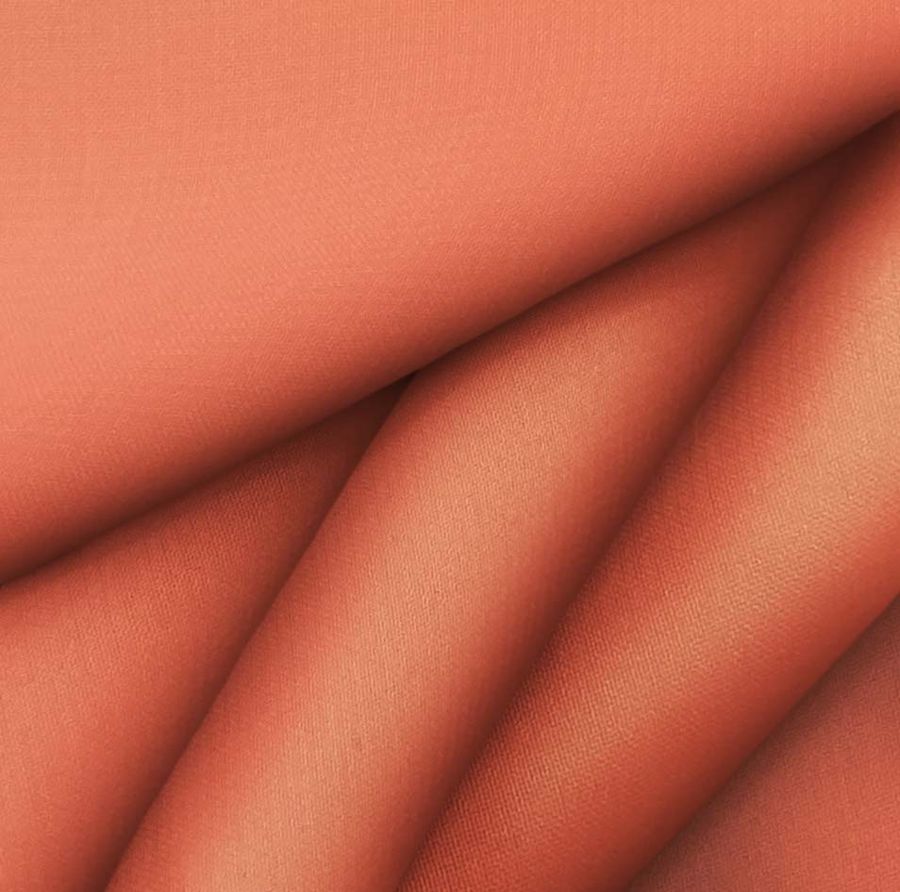La tela base, Gasa Transparente - Salamanca de 100% poliéster, tiene un gramaje de 28 gr/m2 y un ancho de 150 cm. El color liso impreso en esta tela es Rojo Annato, con una combinación cromática CMYK de 0 78 74 0. Este color secundario presenta una tonalidad rojiza suave y cálida, que transmite una sensación de dulzura y pasión. En combinación con otros colores, este tono se puede utilizar con tonalidades naranjas para obtener una apariencia más vibrante y energética, o con tonalidades marrones para un aspecto más misterioso y profundo.
