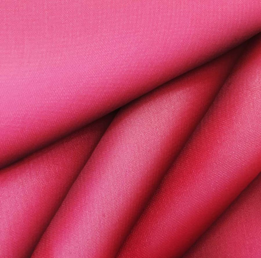 La tela base es una gasa transparente de Salamanca, compuesta por 100% poliéster con un peso 28 gr/m2 y un ancho de 150 cm. En cuanto al color liso impreso, se trata de un rosa-rojizo con tinta magenta al 90%, tinta yellow al 51% y tinta black al 0%, y un CMYK de 0-90-51-0. Este color secundario se puede describir como cálido y vibrante, que combina particularmente bien con tonos beige, dorados y marrones. Es importante mencionar que el tejido está impreso con el color liso a una sola cara utilizando la técnica de impresión digital textil.