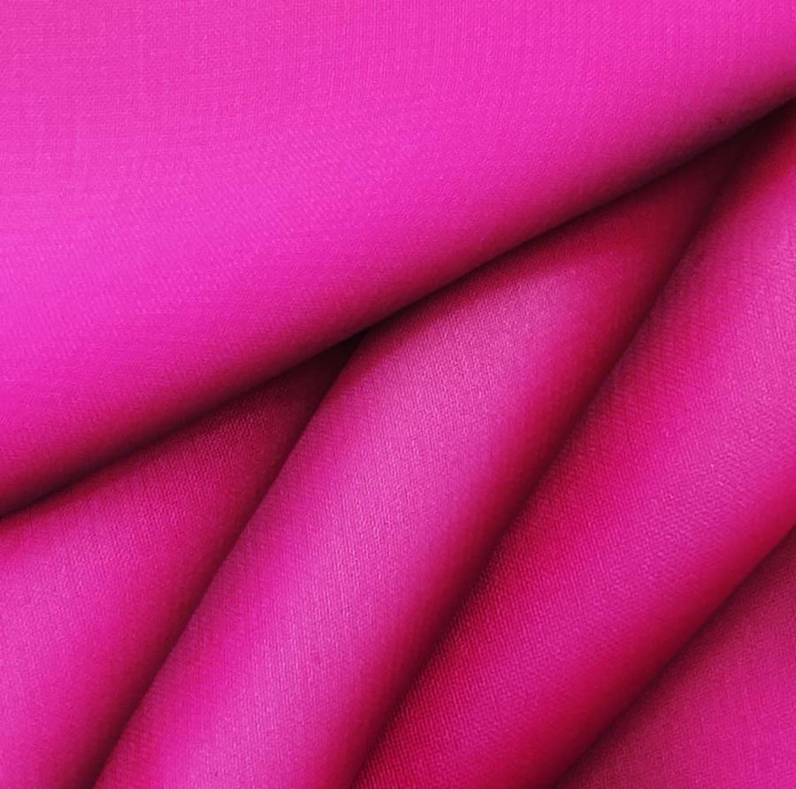 La tela base es Gasa Transparente - Salamanca, con un gramaje de 28 gr/m2 y una composición de 100% poliéster. El color impreso es Rosa Brillante, con una tinta magenta muy dominante y un CMYK de 0 93 8 0. Este color rosa es vibrante y tiene un toque de saturación que le brinda vida y luminosidad al tejido. Combina especialmente bien con colores limpios y suaves, como el blanco, el gris claro y el beige.