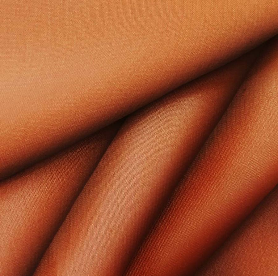 Esta tela se llama Gasa Transparente - Salamanca y está compuesta al 100% de poliéster con un gramaje de 28 gr/m2 y un ancho de 150cm. El color liso impreso es un tono marrón herrumbre, cuyo CMYK es 20 83 100 11, y tiene una sensación terrosa y cálida que aporta elegancia y sofisticación al tejido. Combina muy bien con tonos amarillos, salmón y ocres.