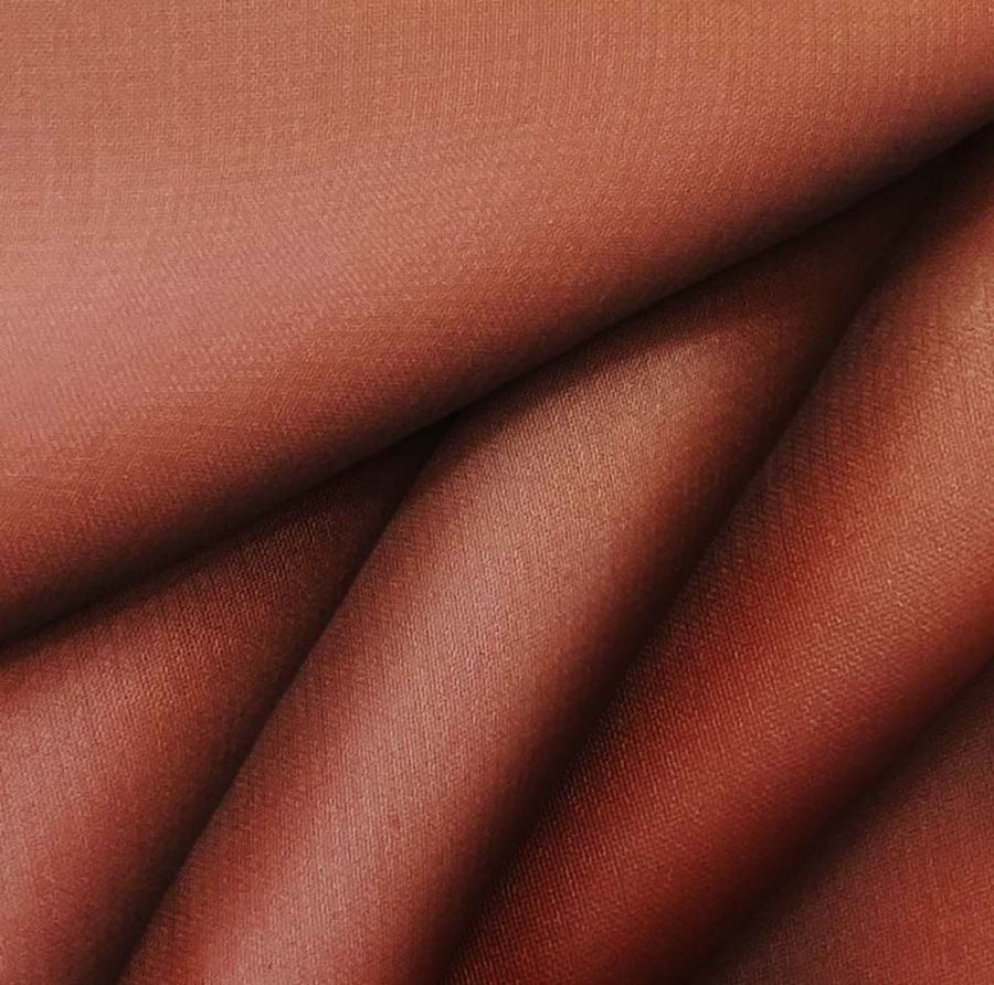 La Gasa Transparente - Salamanca es un tipo de tela de gasa compuesta por 100% poliéster, de 28 gr/m2 y con un ancho de 150 cm. Su color liso impreso está basado en el color Marrón-Kobe reflejando un CMYK de 29 89 96 34. Este color secundario es una mezcla de matices terrosos y cálidos que evocan el otoño y la naturaleza, y combina perfectamente con otros colores como el beige, el verde oliva y el dorado.