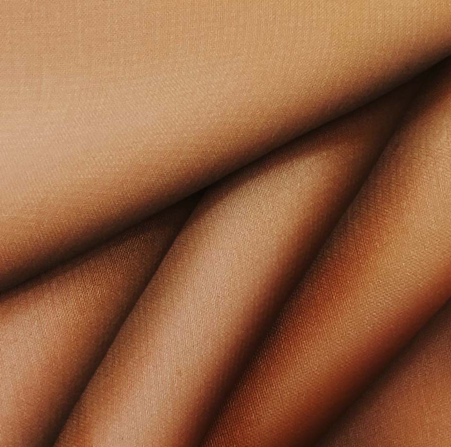 La tela base de esta prenda es la Gasa Transparente - Salamanca, con una composición de 100% poliéster y un gramaje de 28 gr/m2. El color liso impreso se presenta en una combinación de Marrón y Anaranjado representado por el CMYK: 27 68 89 21, lo que resulta en un tono terroso y cálido. Este color secundario aporta una sensación de seguridad, confianza y estabilidad emocional, combinando con otros colores terrosos y neutros para resaltar su cálido efecto.