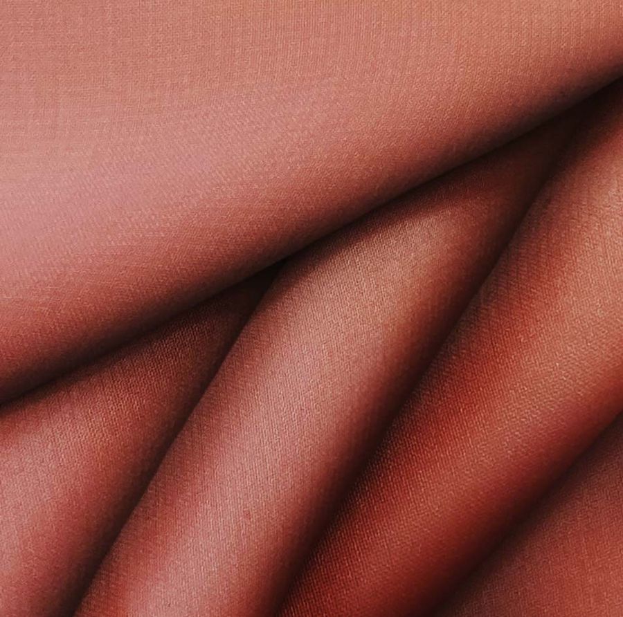 La tela base es la Gasa Transparente - Salamanca, compuesta por 100% poliéster, con un gramaje de 28 gr/m2 y un ancho de 150 cm. El color liso impreso es Marron-Rojo Pardusco con los valores CMYK de 26 83 81 21, que representa un tono terroso, cálido y elegante a la vez. Este color secundario es una combinación de tonalidades rojizas y marrones, lo que permite una gran variedad de combinaciones con otros colores, en particular tonos tierra, marrones, verdes y dorados.