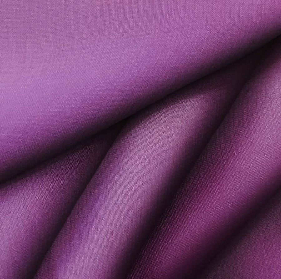 La tela base es una Gasa Transparente - Salamanca de 100% poliéster con un gramaje de 28 gr/m2 y una anchura de 150 cm. El color liso impreso es morado bizantino, con una combinación de tinta cian de 62, magenta de 95, amarillo de 26 y negro de 17, reflejando un CMYK de 62 95 26 17. Este color secundario se caracteriza por ser elegante y sofisticado, con una fuerte carga emocional y vinculado al misterio y la espiritualidad. Combina especialmente con grises, azules, verdes y rosas claros.