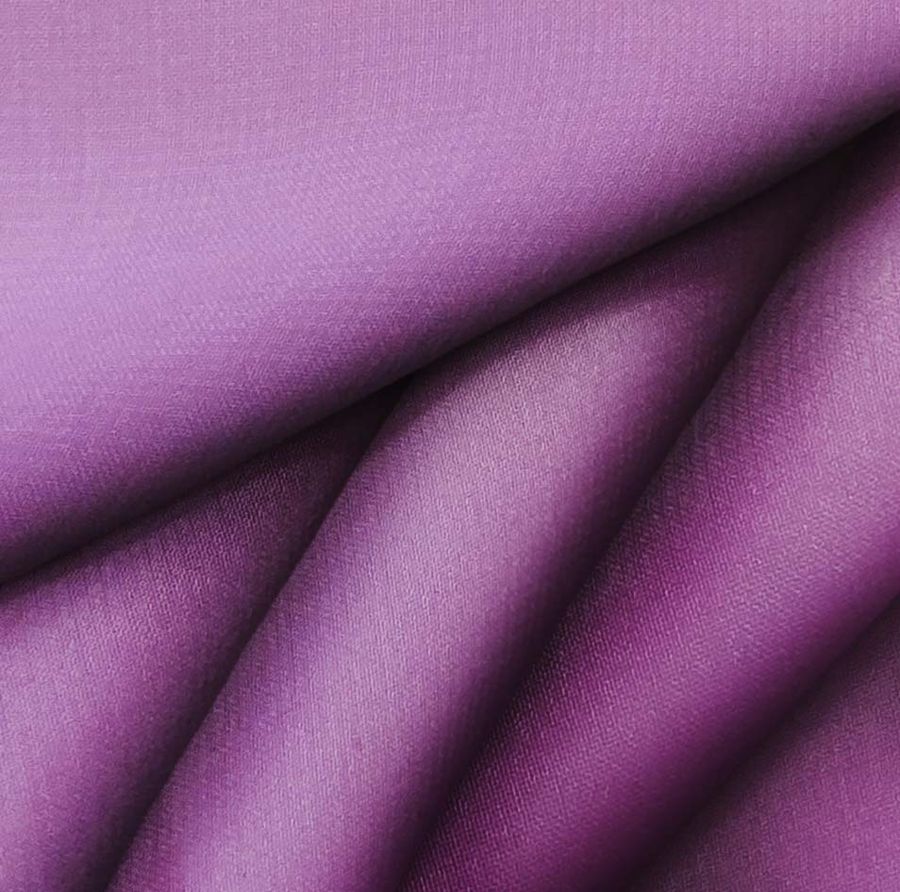 La tela base es Gasa Transparente - Salamanca, un tejido delicado y traslúcido compuesto al 100% de poliéster con un gramaje de 28 gr/m2 y un ancho de 150 cm. El color liso impreso es Morado Ciruela, con un CMYK de 53 82 14 2. Este color es una combinación de tonos de morado y rojo que lo hacen profundo y elegante. El color secundario predominante es claramente el morado, que evoca un sentimiento de misterio y sofisticación. Este color combina perfectamente con tonos neutros como el blanco y el negro, pero también con tonos más llamativos como el fucsia y el magenta.
