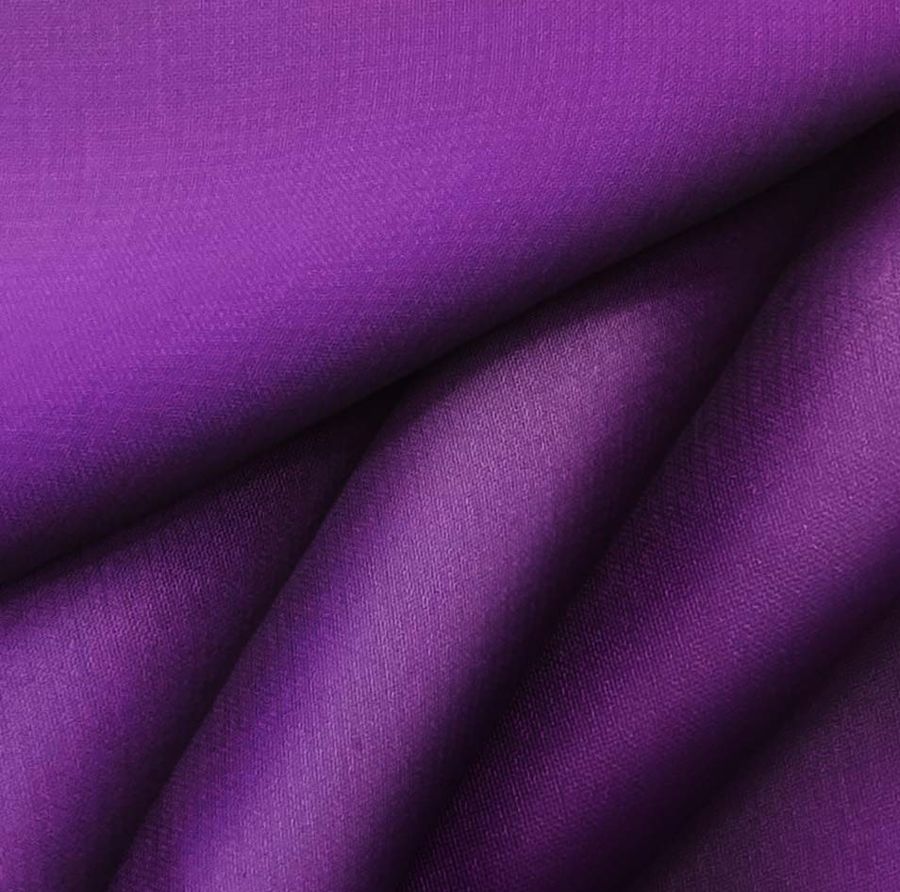 La tela base, Gasa Transparente - Salamanca, es una gasa de 28gr/m2 con composición 100% poliéster y 150cm de ancho. El color liso impreso es de un intenso morado-mora, cuyo CMYK cuenta con una combinación de 82 de cian, 100 de magenta, 29 de amarillo y 24 de negro. Este color liso combina particularmente bien con tonos pastel, verde agua y plateado. La tela está impresa a una sola cara por impresión digital textil.