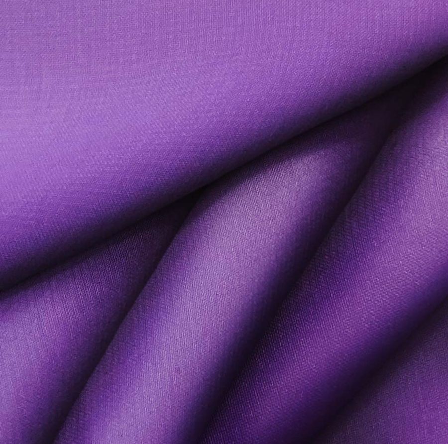 La tela base es la Gasa Transparente - Salamanca, compuesta por 100% poliéster, con un gramaje de 28 gr/m2 y un ancho de 150 cm. El color liso impreso en la tela base es de tonos morados y azul purpureo, con un CMYK de 78 99 3 0. Este color secundario es un tono profundo y misterioso que simboliza la espiritualidad y la creatividad. Combina especialmente bien con colores turquesa y amarillo, creando una paleta de colores armónica y equilibrada.