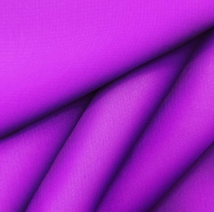 La tela base de esta descripción es la Gasa Transparente - Salamanca, una tela de gasa compuesta por 100% POLIÉSTER, con un gramaje de 28 gr/m2 y un ancho de 150 cm. El color liso impreso es de Morado, Púrpura Eléctrico, con un contenido de 64 de tinta Cyan y 81 de tinta Magenta en el CMYK.