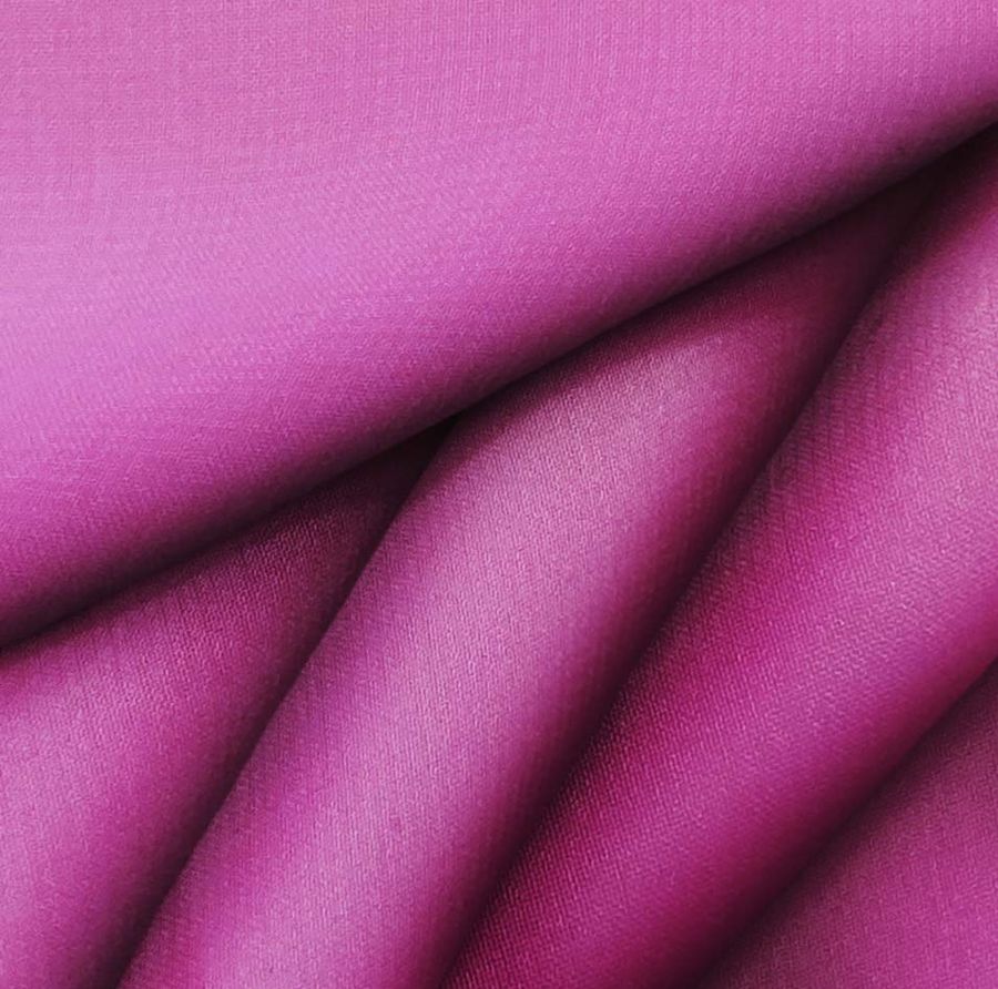 La tela base es la Gasa Transparente - Salamanca, con una composición de 100% poliéster y un gramaje de 28 gr/m2. El color liso impreso es de un Morado Violeta Rojizo Medio, con un CMYK de 28 90 6 0. Este color combina perfectamente con tonalidades neutras como el beige, blanco y negro.