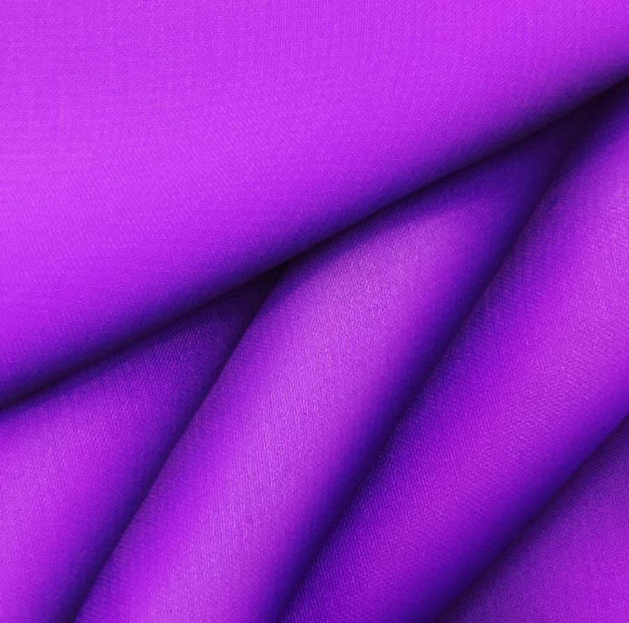 La tela base es la Gasa Transparente - Salamanca, con un tipo de tela de Gasa y una composición del 100% de poliéster, lo que le da una textura visual y táctil transparente y delgada. El color liso impreso es de un tono Morado Vivid Violeta de acuerdo con los valores del CMYK, que son 72% cyan, 81% magenta, 0% amarillo y 0% negro. Este color secundario se combina bien con tonos cálidos como los marrones y naranjas, así como con tonos más fríos como los azules y verdes.