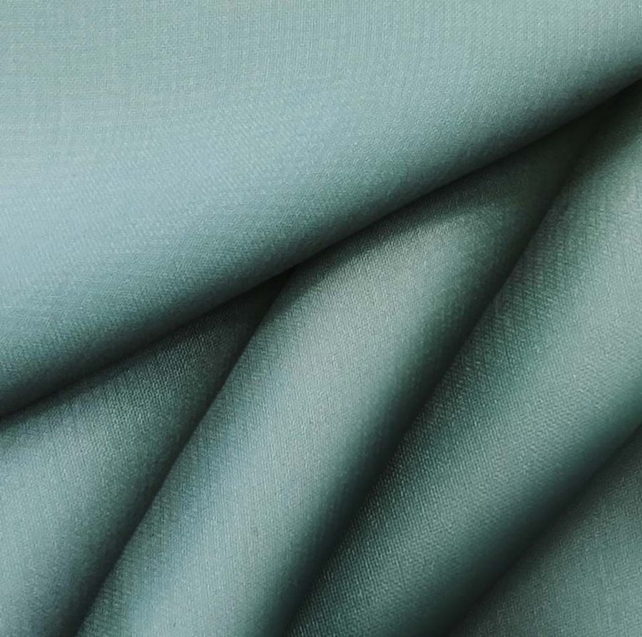 La tela base de este tejido es la Gasa Transparente - Salamanca, compuesta al 100% de poliéster, con un gramaje de 28 gr/m2 y un ancho de 150 cm. El color liso impreso es una combinación de verde y ceniza, con un CMYK de 64 34 46 18. El color resultante es un tono suave, con presencia de tonos grises y verdes. El verde aporta una sensación de frescura y renovación, mientras que el ceniza transmite un sentimiento de estabilidad y equilibrio. Este color secundario combina a la perfección con tonos neutros, como el blanco o el negro, y también es posible combinarlo con tonos más vivos, como el rojo o el naranja.
