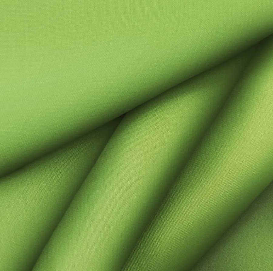 La tela base es la Gasa Transparente - Salamanca, de composición 100% poliéster, con un gramaje de 28gr/m2 y un ancho de 150cm. El color liso impreso en esta tela es el Verde Fronda, con un CMYK de 64-16-100-2. Este color se caracteriza por su frescura y naturalidad, evocando la estación del verano y la vida al aire libre. Combina bien con tonos tierra, marrones, naranjas y amarillos claros.