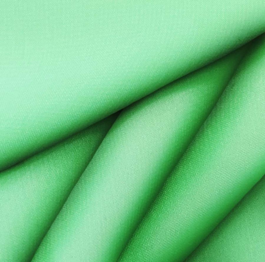 La tela base es una Gasa Transparente - Salamanca de composición 100% poliéster, con un gramaje de 28 gr/m2 y un ancho de 150 cm. El color liso impreso es un verde heliógeno, con un CMYK de 52 0 67 0, a una sola cara por impresión digital textil. La tonalidad verde transmite armonía, esperanza y equilibrio, y se combina particularmente bien con tonos ocres o marrones.