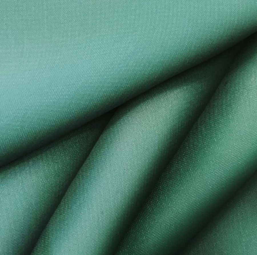 La tela base de esta prenda es la Gasa Transparente - Salamanca, de 100% poliéster, con un gramaje de 28 gr/m2 y un ancho de 150 cm. El color liso impreso es un verde pátina, cuyo CMYK es 76 33 63 20, destacando por su frescura y elegancia. Este color secundario combina perfectamente con otros colores como el blanco, el dorado, el plateado y otros tonos verdes. Cabe destacar que la tela está impresa con el color liso a una sola cara por impresión digital textil.
