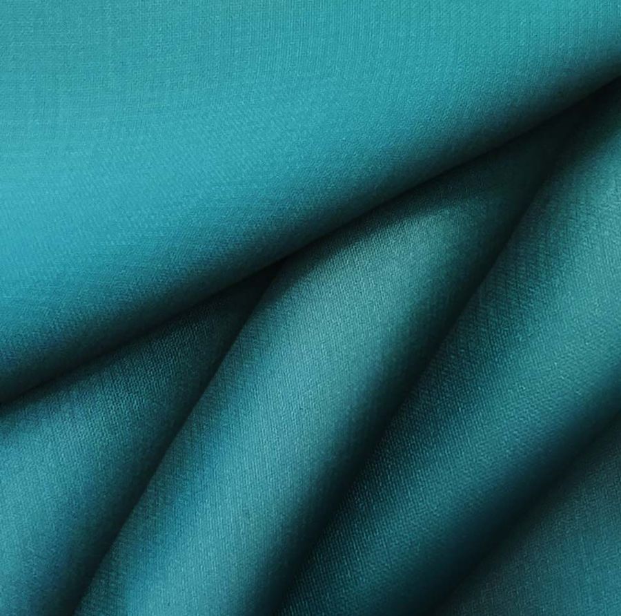 La tela base es Gasa Transparente - Salamanca, un tipo de tela muy delicada y transparente compuesta por 100% poliéster con un gramaje de 28 gr/m2 y un ancho de 150 cm. El color liso impreso es Azul del Golfo, el cual presenta un CMYK de 88 40 45 32 y se combina especialmente bien con colores como el blanco, el plateado y el gris. Es importante destacar que la impresión del color liso se realiza a una sola cara y mediante impresión digital textil, por lo que la tela no está tintada sino impresa.