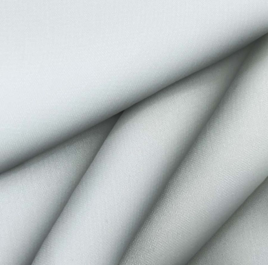 La tela base, Gasa Transparente - Salamanca, es una gasa de poliéster de 28 gr/m2 con un ancho de 150 cm. El color liso impreso es Azul Escarcha, con un CMYK de 15 2 8 0, lo que indica una prevalencia de cian y un toque de amarillo, lo que genera un tono frío y suave similar al cielo de invierno. Este color se combina perfectamente con tonos blancos o crudos para crear armonía y con colores más cálidos para generar contrastes.