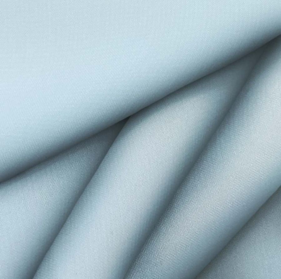 La tela base es la Gasa Transparente - Salamanca, compuesta por un 100% de poliéster con un gramaje de 28 gr/m2 y un ancho de 150 cm. El color liso impreso es Azul Glaciar, con un CMYK de 37 6 6 0, lo que indica una presencia predominante de cian y una baja presencia de magenta y amarillo, otorgando un tono frío y profundo. Este color secundario evoca la calma y la serenidad del hielo, combinado con tonalidades de blanco, gris y verde, y también puede combinarse armónicamente con tonos más cálidos como rosa, coral y dorado. La tela base está impresa con este color liso a una sola cara por impresión digital textil, lo que significa que el color impreso se encuentra solo en una de las caras del tejido.