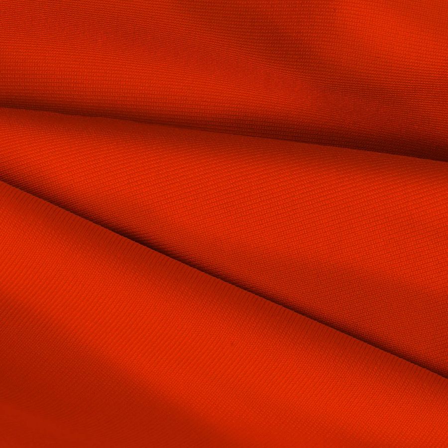 La tela base es Lycra de Poliéster - Nairobi de 270 gr/m2, y su color liso impreso se compone de una combinación de rojo y annato oscuro con un CMYK de 0 93 100 0. El color annato oscuro es un tono terroso y cálido que combina bien con tonos neutros y colores similares a la roja, como naranjas, amarillos y marrones. El tejido está impreso con el color liso a una sola cara por impresión digital textil, lo que significa que se ha aplicado el color impreso solo en una cara del tejido.