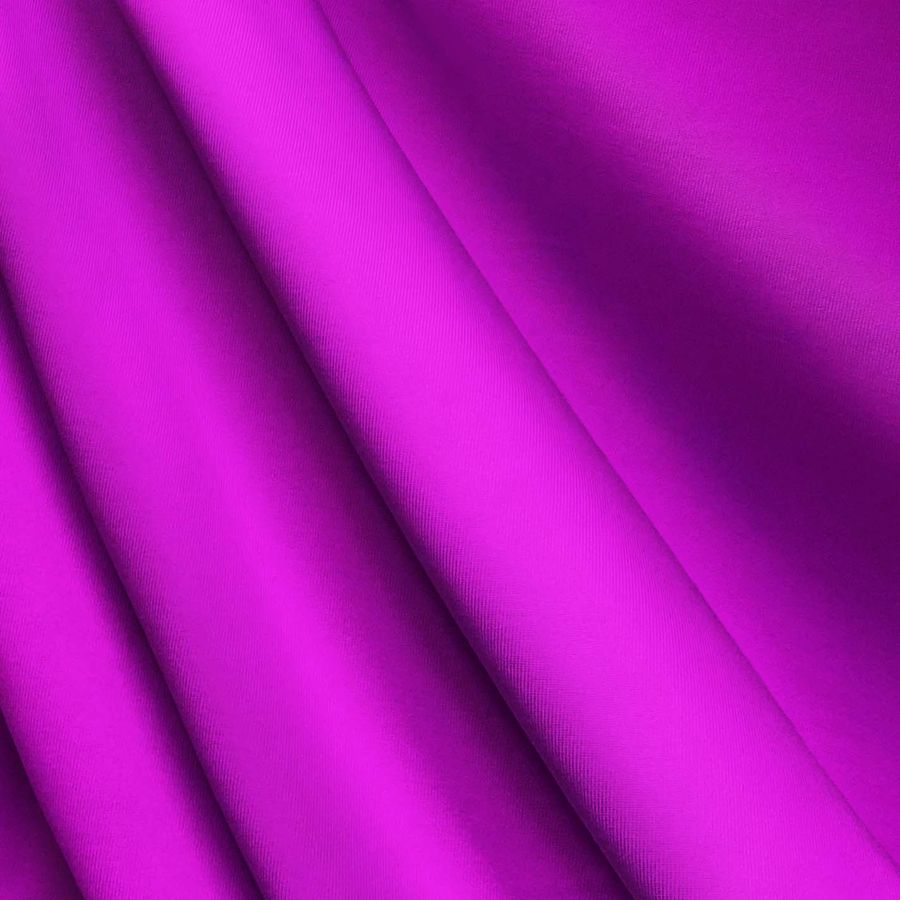 La Lycra de Poliéster-Nairobi es una tela elástica con una composición de 82% poliéster y 18% elastano. El color liso impreso es un rosa magenta vibrante, con una mezcla de tinta cyan de 41 y tinta magenta de 78. Este color secundario simboliza la pasión, el amor y la energía positiva. Además, combina particularmente bien con tonos neutros como el blanco, el gris y el negro.