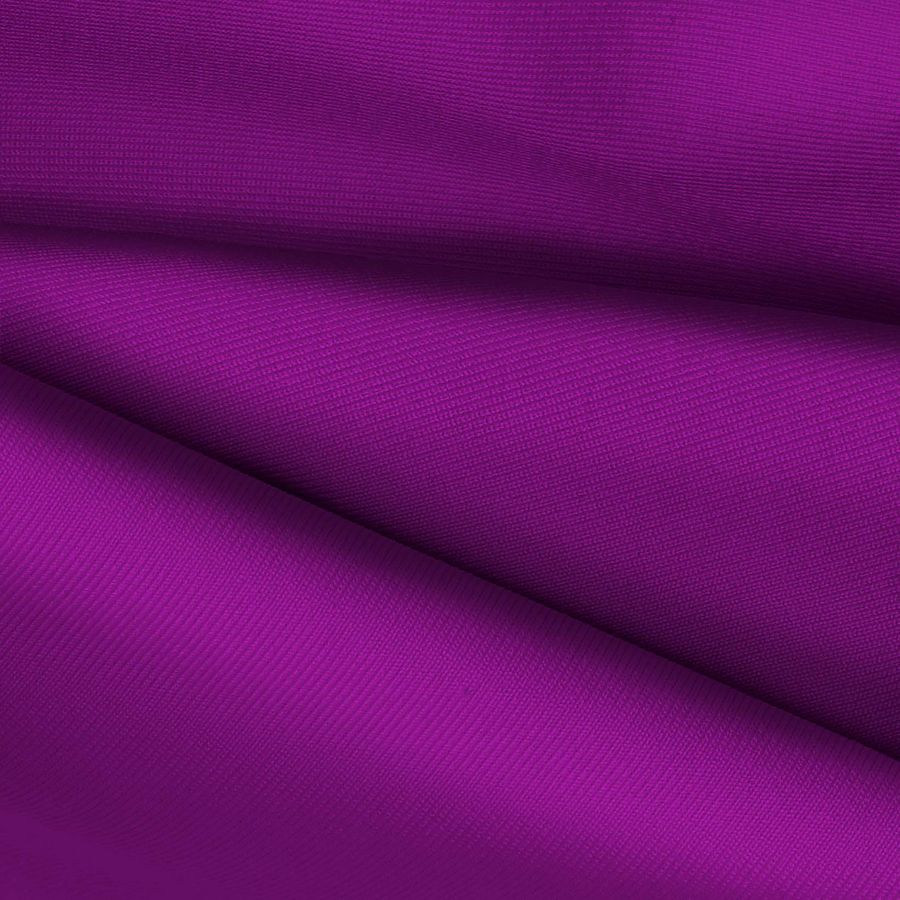 La tela base es una Lycra de Poliéster de 270 gr/m2, con composición de 82% poliéster y 18% elastano. El color liso impreso es Morado Mardi Gras, con un CMYK de 60 100 0 0. Este tono presenta un matiz violeta oscuro con matices cálidos, lo que lo hace ideal para prendas deportivas o de baño. Este color combina perfectamente con tonalidades claras, como el blanco o el rosa, así como con tonos más oscuros como el negro o el gris.