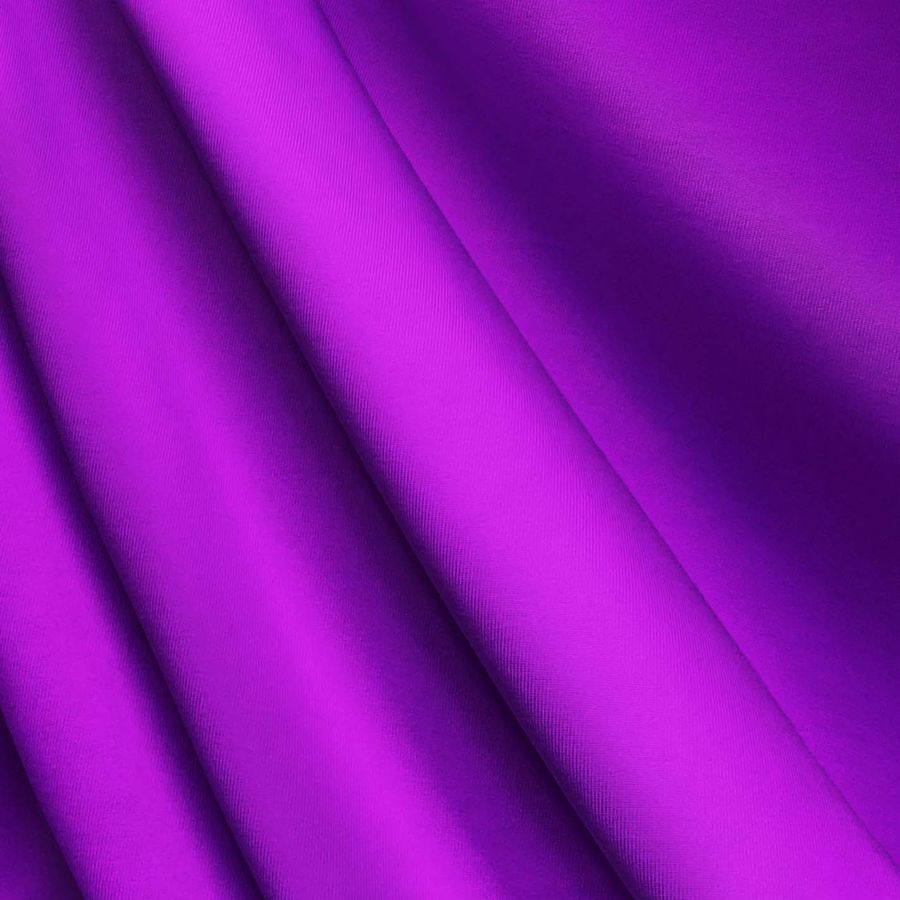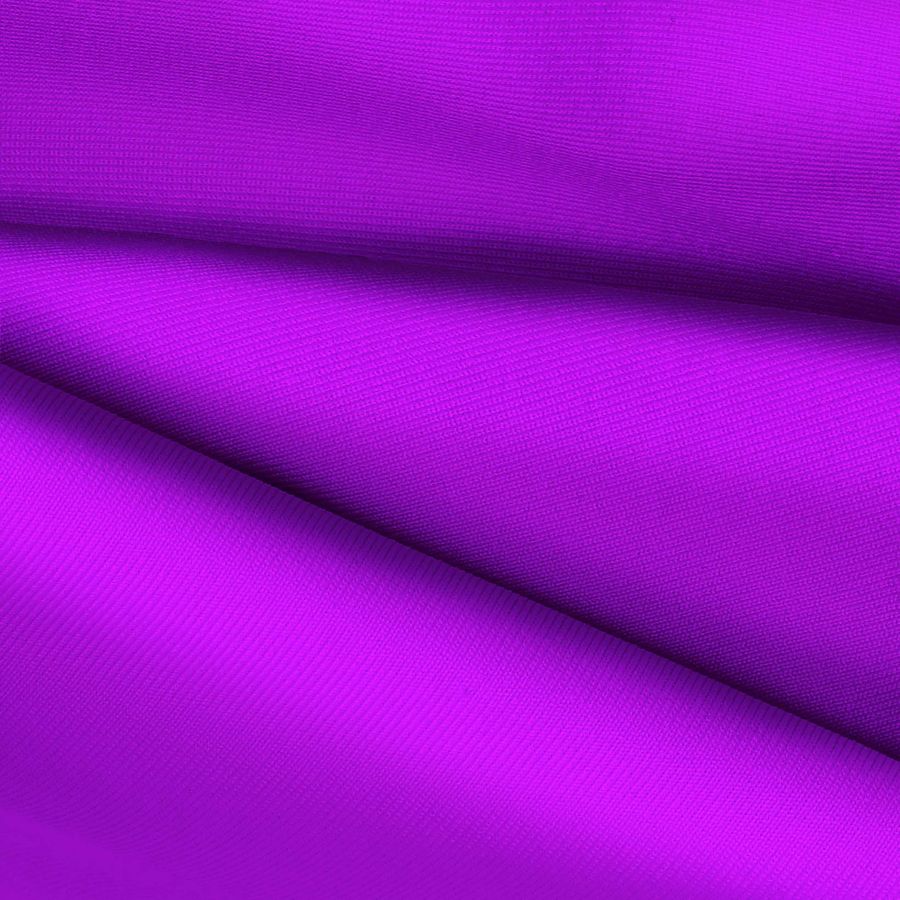 La tela base, Lycra de Poliéster - Nairobi de 270 gr/m2, presenta una textura elástica y un acabado resistente al cloro, perfecto para su aplicación en prendas deportivas como mallas, leggings y bañadores. El color liso impreso en un vibrante Morado Púrpura Eléctrico, con una combinación de tinta Cyan (64) y Magenta (81), refleja un aspecto moderno y femenino. El color combina muy bien con tonos neutros como el blanco y el negro, pero también con colores pasteles como el rosa y el menta.