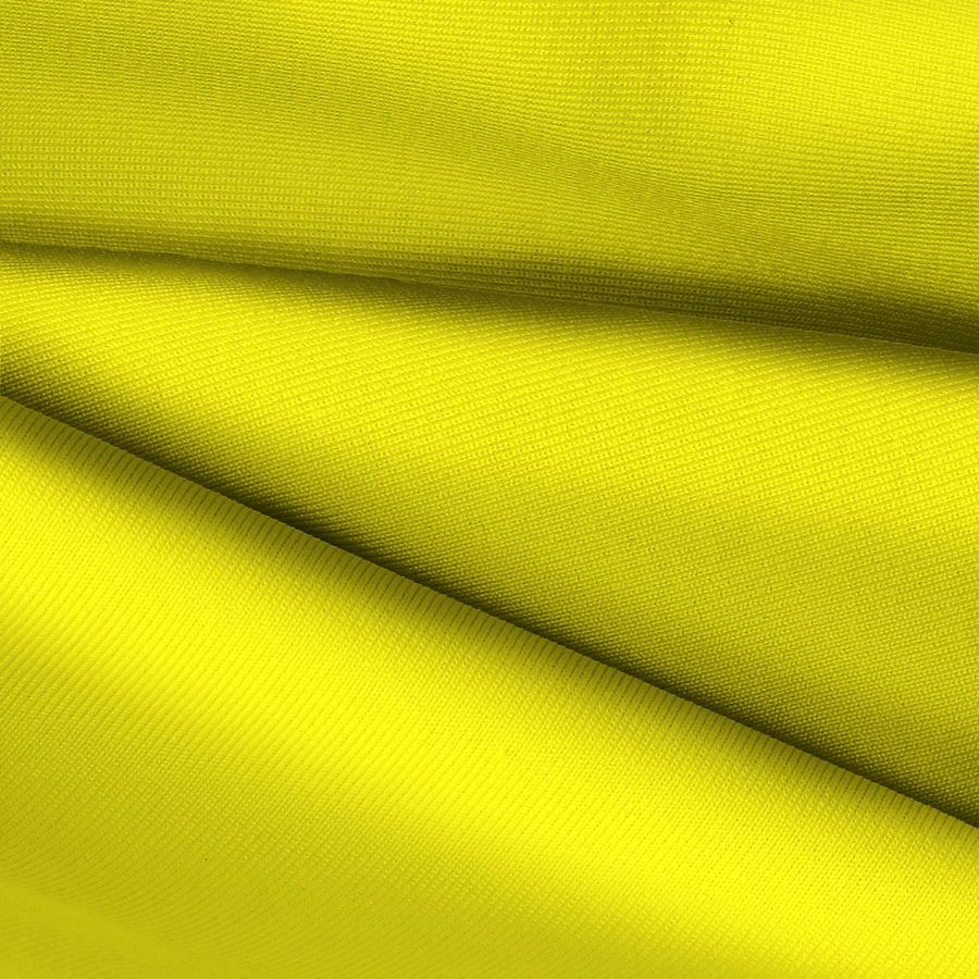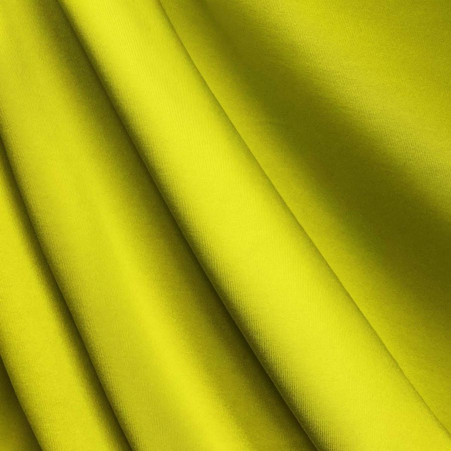 La tela base de este tejido es de lycra de poliéster Nairobi, con un gramaje de 270 gr/m2 y un ancho de 150 cm. El color liso impreso es de un amarillo de cadmio, con una combinación de tinta de 8 de cian, 0 de magenta, 88 de amarillo y 0 de negro, dando un CMYK de 8 0 88 0. Este color secundario es vibrante y llamativo, similar a la tonalidad del limón. Complementa perfectamente con colores como el negro, verde oscuro y rojo oscuro.