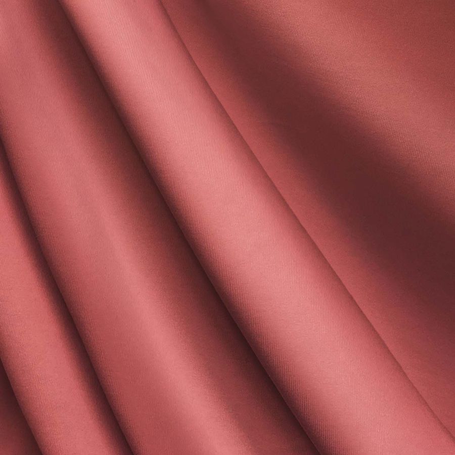 La tela base es una Lycra de Poliéster - Nairobi de 270 gr/m2, compuesta por 82% poliéster y 18% elastano, de textura elástica y tacto suave. El color liso impreso es Rojo Piel Roja, con una combinación de tintas CMYK de 15 74 56 4. Este color secundario simboliza la pasión y el deseo, combinando a la perfección con tonos tierra y dorados.