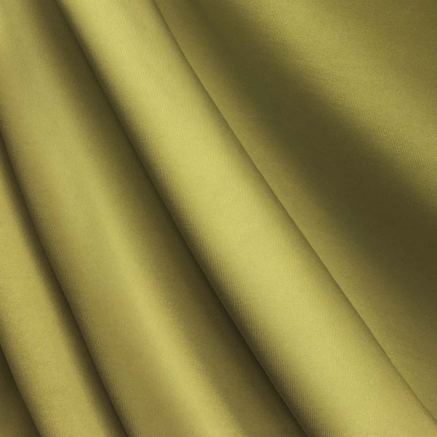 La tela base, Lycra de Poliéster - Nairobi de 270 gr/m2, cuenta con una textura elástica y un acabado resistente al cloro incluyendo un factor de protección UV muy alta de 50+. El color liso impreso en esta tela tiene un CMYK de 34 31 76 14, lo que se traduce en un verde latón caracterizado por un tono terroso y profundo. Este color secundario combina particularmente bien con tonos cálidos como el marrón y el naranja, así como con colores neutros como el gris y el marfil.