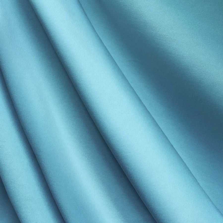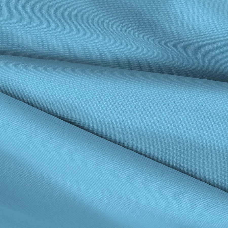 Esta es la tela Lycra de Poliéster - Nairobi de 270 gr/m2 de color azul claro impreso con un CMYK de 55 3 0 0. El color secundario es luminoso y vibrante, evocando un ambiente fresco y relajado. Se combina bien con tonos neutros y pasteles que complementan su suavidad.
