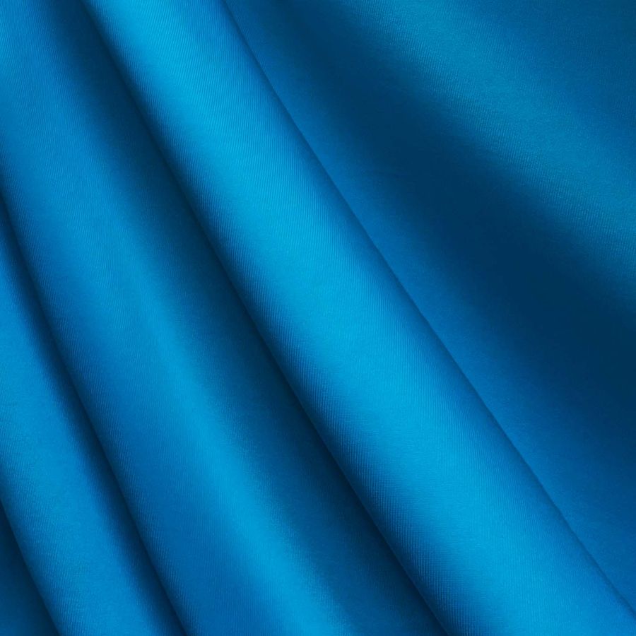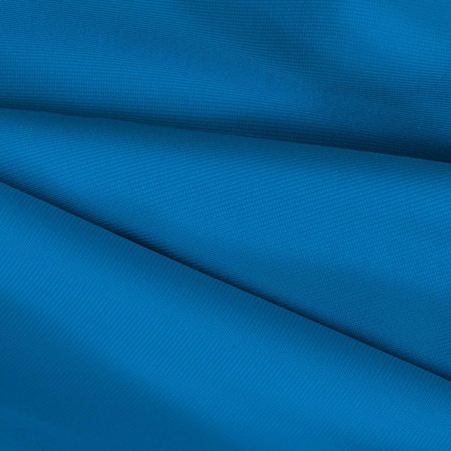 La tela base es una Lycra de Poliéster, específicamente la Nairobi de 270 gr/m2, con una composición del 82% de poliéster y un 18% de elastano, lo que la hace elástica y con un tacto suave. El color liso impreso del tejido es un azul azur, indicado por un CMYK de 87 49 0 0, lo que lo hace un azul intenso con un toque de verde. El color secundario combina perfectamente con otros colores como el blanco, el negro o los grises, y también puede ser combinado con tonos más vivos como el naranja o el rosa.
