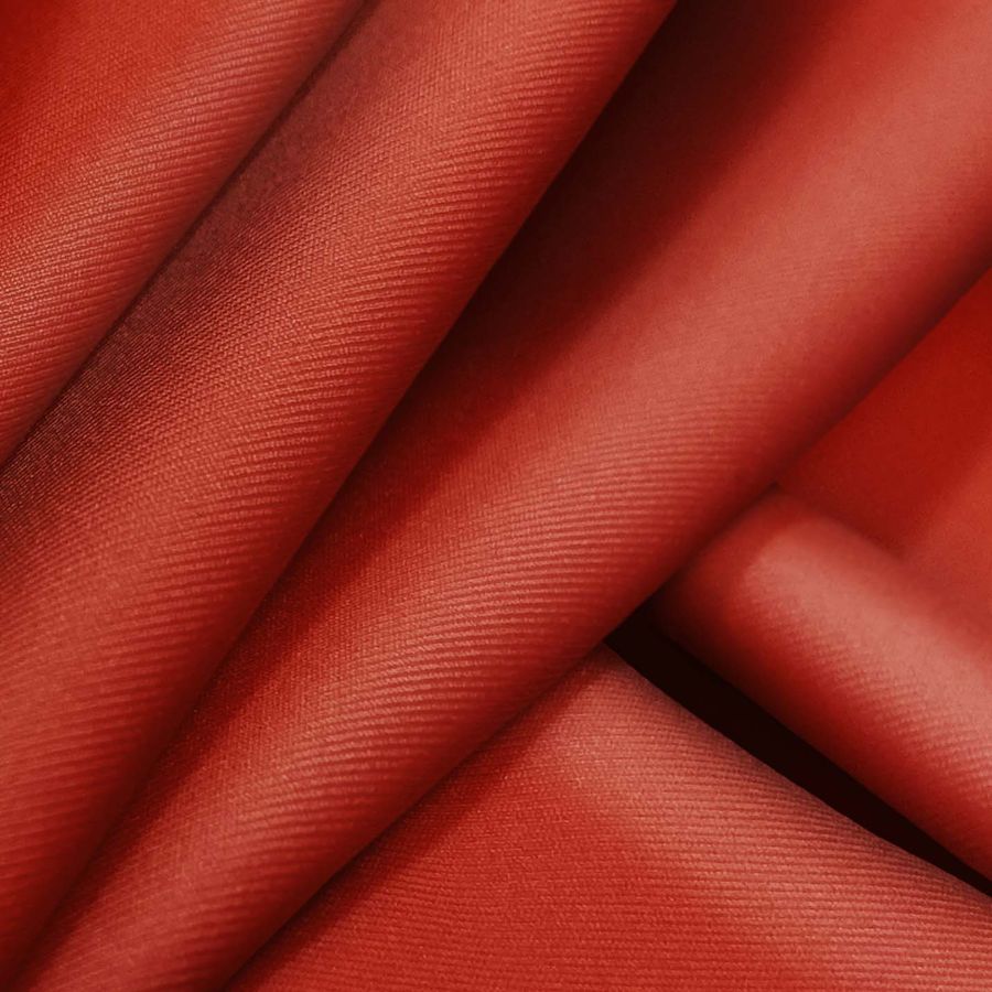 La tela base es Lycra Reciclada - Recycled de 190 gr/m2 en color liso Rojo Ladrillo refractario, representado por el CMYK 23 97 100 19. Este color simboliza la fuerza, la pasión y la energía, la intensidad de un tono rojo anaranjado que evoca la tierra, el fuego y la arcilla. Combina muy bien con tonos tierra, verdes y amarillos. Cabe mencionar que la tela está impresa con una sola cara por impresión digital textil, no es un tejido tintado sino impreso.